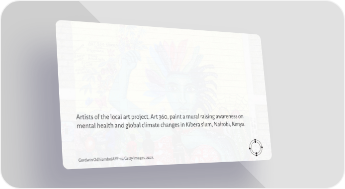 Artists of the local art project, Art 360, paint a mural raising awareness on mental health and global climate changes in Kibera slum, Nairobi, Kenya. Gordwin Odhiambo/AFP via Getty Images. 2021.