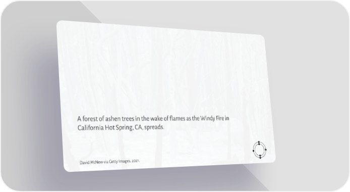 A forest of ashen trees in the wake of flames as the Windy Fire in California Hot Spring, CA, spreads. David McNew via Getty Images. 2021.