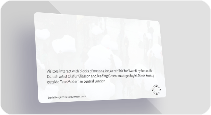 Visitors interact with blocks of melting ice, at exhibit ‘Ice Watch’ by Icelandic- Danish artist Olafur Eliasson and leading Greenlandic geologist Minik Rosing outside Tate Modern in central London. Daniel Leal/AFP via Getty Images. 2018.