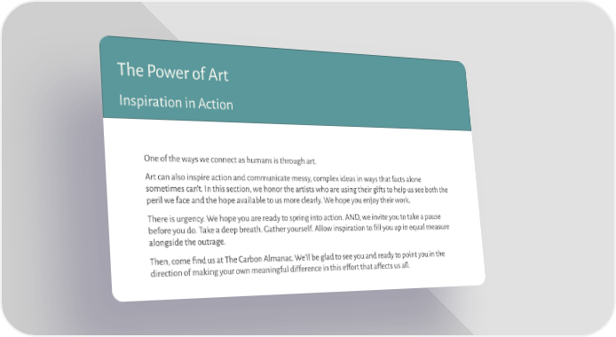 The Power of Art Inspiration in Action One of the ways we connect as humans is through art. Art can also inspire action and communicate messy, complex ideas in ways that facts alone sometimes can’t. In this section, we honor the artists who are using their gifts to help us see both the peril we face and the hope available to us more clearly. We hope you enjoy their work. There is urgency. We hope you are ready to spring into action. AND, we invite you to take a pause before you do. Take a deep breath. Gather yourself. Allow inspiration to 昀椀ll you up in equal measure alongside the outrage. Then, come 昀椀nd us at The Carbon Almanac. We’ll be glad to see you and ready to point you in the direction of making your own meaningful difference in this effort that affects us all.