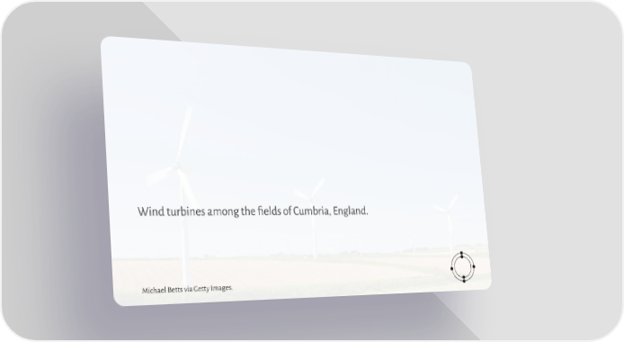 Wind turbines among the 昀椀elds of Cumbria, England. Michael Betts via Getty Images.