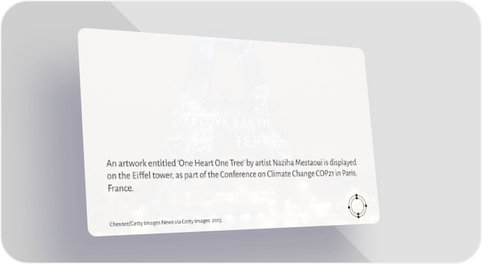 An artwork entitled ‘One Heart One Tree’ by artist Naziha Mestaoui is displayed on the Eiffel tower, as part of the Conference on Climate Change COP21 in Paris, France. Chesnot/Getty Images News via Getty Images. 2015.