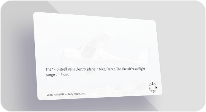The “Pipistrell Velis Electro” plane in Nice, France. The aircraft has a flight range of 1 hour. Valery Hache/AFP via Getty Images. 2021.