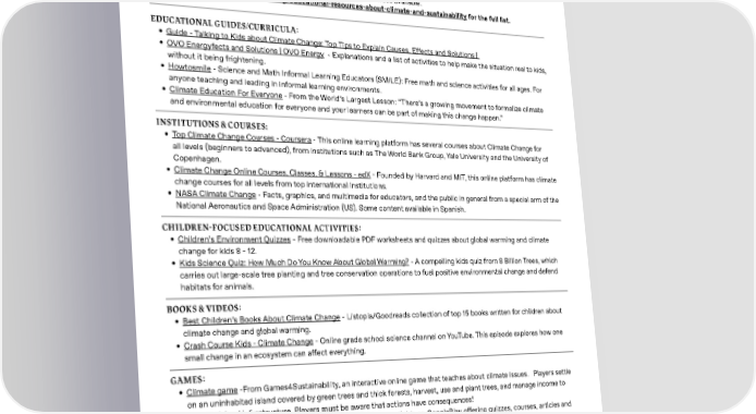 EDUCATORS’ RESOURCE LIST The Carbon Almanac Education Team has compiled extensive resources for educators working in many di昀昀erent settings. Included are educators’ guides, websites, videos, podcasts, books, and lesson plans. Resources are organized by resource type. Below is a sample of resources available. See thecarbonalmanac.org/educational-resources-about-climate-and-sustainability for the full list. EDUCATIONAL GUIDES/CURRICULA: • Guide - Talking to Kids about Climate Change: Top Tips to Explain Causes, E昀昀ects and Solutions | • OVO Energyfects and Solutions | OVO Energy - Explanations and a list of activities to help make the situation real to kids, without it being frightening. • Howtosmile - Science and Math Informal Learning Educators (SMILE): Free math and science activities for all ages. For anyone teaching and leading in informal learning environments. • Climate Education For Everyone - From the World’s Largest Lesson: “There’s a growing movement to formalize climate and environmental education for everyone and your learners can be part of making this change happen.” INSTITUTIONS & COURSES: • Top Climate Change Courses - Coursera - This online learning platform has several courses about Climate Change for all levels (beginners to advanced), from institutions such as The World Bank Group, Yale University and the University of Copenhagen. • Climate Change Online Courses, Classes, & Lessons - edX - Founded by Harvard and MIT, this online platform has climate change courses for all levels from top international institutions. • NASA Climate Change - Facts, graphics, and multimedia for educators, and the public in general from a special arm of the National Aeronautics and Space Administration (US). Some content available in Spanish. CHILDREN-FOCUSED EDUCATIONAL ACTIVITIES: • Children’s Environment Quizzes - Free downloadable PDF worksheets and quizzes about global warming and climate change for kids 8 - 12. • Kids Science Quiz: How Much Do You Know About Global Warming? - A compelling kids quiz from 8 Billion Trees, which carries out large-scale tree planting and tree conservation operations to fuel positive environmental change and defend habitats for animals. BOOKS & VIDEOS: • Best Children’s Books About Climate Change - Listopia/Goodreads collection of top 15 books written for children about climate change and global warming. • Crash Course Kids - Climate Change - Online grade school science channel on YouTube. This episode explores how one small change in an ecosystem can a昀昀ect everything. GAMES: • Climate game -From Games4Sustainability, an interactive online game that teaches about climate issues. Players settle on an uninhabited island covered by green trees and thick forests, harvest, use and plant trees, and manage income to develop island infrastructure. Players must be aware that actions have consequences! • ClimateScience | Learn About Climate Solutions - An app available on GooglePlay o昀昀ering quizzes, courses, articles and infographics with simple explanations and illustrations. Rated E for Everyone. VOLUNTEERING & ACTIVISM: • Earth Guardians - Organization that trains and empowers youth to be e昀昀ective leaders. Using art, music, storytelling, on the ground projects, civic engagement, and legal action, they advance solutions to the critical issues at the intersections of environmental and climate justice. • 7 Climate and Environmental Volunteer Projects for Teens - From We Are Teachers, ideas for clean-up, habitat restoration, planting food, and other simple yet impactful projects. 65