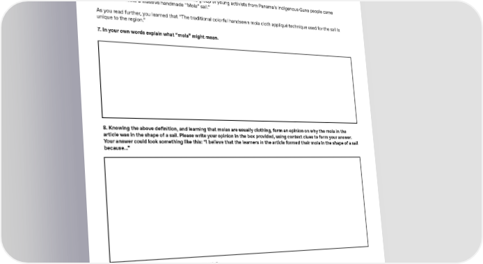 Worksheet: Analyzing the Poem and the Article, P3 Now that your web is complete, we will read the article “Indigenous Youth Represent Their Culture to Demand Action” in the ‘Whose Job is it?’ section of The Carbon Almanac. As we read, think about Maya Angelou’s poem “A Brave and Startling Truth” and the themes Peace, Power of Choice, and Truth. Read the article As you read the article you discovered that “...a group of young activists from Panama’s Indigenous Guna people came together to create a massive handmade “Mola” sail.” As you read further, you learned that “The traditional colorful handsewn mola cloth appliqué technique used for the sail is unique to the region.” 7. In your own words explain what “mola” might mean. 8. Knowing the above de昀椀nition, and learning that molas are usually clothing, form an opinion on why the mola in the article was in the shape of a sail. Please write your opinion in the box provided, using context clues to form your answer. Your answer could look something like this: “I believe that the learners in the article formed their mola in the shape of a sail because…” Recall the poem “A Brave and Startling Truth.” Contemplate the following quotes: “It (the mola sail) symbolizes our deep caring of our Mother the Earth with its honoring of the sky, sun, sea, earth and of all living beings. It’s the sail that unites us and moves us forward to 昀椀ght for the forests, rivers and oceans of our Mother.” ~Agar Inklenia “We must continue growing stronger in our resolve, smarter in our organization and united in our action with our brothers and sisters of lands close by and far away.” ~Iniquilipi Chiari 11