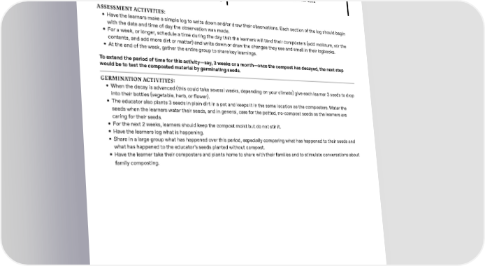SECTION 6 - Solutions Compost-ables - Germination (Optional Activity), PART B, P3 DURATION ENDURING UNDERSTANDING • 30-minute sessions for assessment as desired • Transferring carbon back into our soils • Additional 30 minute sessions for germination activity ASSESSMENT ACTIVITIES: • Have the learners make a simple log to write down and/or draw their observations. Each section of the log should begin with the date and time of day the observation was made. • For a week, or longer, schedule a time during the day that the learners will tend their composters (add moisture, stir the contents, and add more dirt or matter) and write down or draw the changes they see and smell in their logbooks. • At the end of the week, gather the entire group to share key learnings. To extend the period of time for this activity—say, 3 weeks or a month—once the compost has decayed, the next step would be to test the composted material by germinating seeds. GERMINATION ACTIVITIES: • When the decay is advanced (this could take several weeks, depending on your climate) give each learner 3 seeds to drop into their bottles (vegetable, herb, or 昀氀ower). • The educator also plants 3 seeds in plain dirt in a pot and keeps it in the same location as the composters. Water the seeds when the learners water their seeds, and in general, care for the potted, no-compost seeds as the learners are caring for their seeds. • For the next 2 weeks, learners should keep the compost moist but do not stir it. • Have the learners log what is happening. • Share in a large group what has happened over this period, especially comparing what has happened to their seeds and what has happened to the educator’s seeds planted without compost. • Have the learner take their composters and plants home to share with their families and to stimulate conversations about family composting. T RESOURCES: • The Carbon Almanac - Here’s What’s True: Agriculture, Forestry, Land Use, p. 68/ 013 • The Carbon Almanac - Solutions: Using Agriculture as a Carbon Sink, p.202/ 218 • The Carbon Almanac - Solutions: Drip Irrigation, p.204/ 248 • The Carbon Almanac - Solutions: Backyard Regeneration, p.210/ 108 • A log or journal of some sort to keep notes of changes. This could be paper and pencil or computer. 42