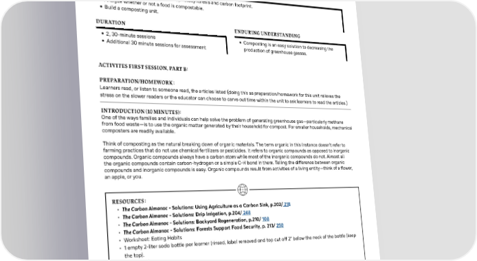 SECTION 6 - Solutions 10+, Agriculture & Science Compost-ables, PART B, P1 AGE RANGE: 10+ Agriculture & Science SUBJECTS: OBJECTIVES PART B • De昀椀ne carbon sink, compost, soil, photosynthesis and carbon footprint. • Analyze whether or not a food is compostable. • Build a composting unit. DURATION ENDURING UNDERSTANDING • 2, 30-minute sessions • Composting is an easy solution to decreasing the • Additional 30 minute sessions for assessment production of greenhouse gasses. ACTIVITES FIRST SESSION, PART B: PREPARATION/HOMEWORK: Learners read, or listen to someone read, the articles listed (doing this as preparation/homework for this unit relieves the stress on the slower readers or the educator can choose to carve out time within the unit to ask learners to read the articles.) INTRODUCTION (10 MINUTES): One of the ways families and individuals can help solve the problem of generating greenhouse gas—particularly methane from food waste—is to use the organic matter generated by their household for compost. For smaller households, mechanical composters are readily available. Think of composting as the natural breaking down of organic materials. The term organic in this instance doesn’t refer to farming practices that do not use chemical fertilizers or pesticides. It refers to organic compounds as opposed to inorganic compounds. Organic compounds always have a carbon atom while most of the inorganic compounds do not. Almost all the organic compounds contain carbon-hydrogen or a simple C-H bond in them. Telling the di昀昀erence between organic compounds and inorganic compounds is easy. Organic compounds result from activities of a living entity—think of a 昀氀ower, an apple, or you. T RESOURCES: • The Carbon Almanac - Solutions: Using Agriculture as a Carbon Sink, p.202/ 218 • The Carbon Almanac - Solutions: Drip Irrigation, p.204/ 248 • The Carbon Almanac - Solutions: Backyard Regeneration, p.210/ 108 • The Carbon Almanac - Solutions: Forests Support Food Security, p. 213/ 250 • Worksheet: Eating Habits • 1 empty 2-liter soda bottle per learner (rinsed, label removed and top cut off 2” below the neck of the bottle (keep the top). • Sharp knife. • Nail. • Shredded newspaper. • Dirt from outside. Learners can bring in soil from home, purchase soil from a store, or dig it up from somewhere on the school grounds. The poorer the soil quality, the better. • Compostable vegetation (yard waste or non-meat food). • Handful of dry leaves. • Spray bottle full of water. • A journal of some sort to keep notes of changes. This can be paper and pencil or computer, educator’s choice. 40