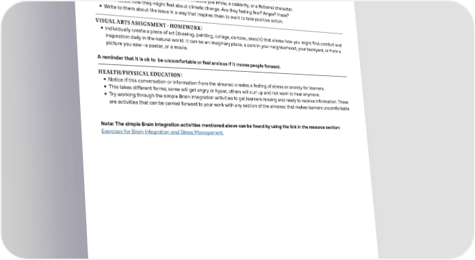 SECTION 5 - Impacts ,P2 Climate Anxiety ACTIVITES CONTINUED: WRITING ASSIGNMENT: (learner does this individually) • Pick a person to write to. This could be someone you know, a celebrity, or a 昀椀ctional character. • Think about how they might feel about climate change. Are they feeling fear? Anger? Hope? • Write to them about the issue in a way that inspires them to want to take positive action. VISUAL ARTS ASSIGNMENT - HOMEWORK: • individually create a piece of art (drawing, painting, collage, cartoon, sketch) that shows how you might 昀椀nd comfort and inspiration daily in the natural world. It can be an imaginary place, a park in your neighborhood, your backyard, or from a picture you saw--a poster, or a movie. A reminder that it is ok to be uncomfortable or feel anxious if it moves people forward. HEALTH/PHYSICAL EDUCATION: • Notice if this conversation or information from the almanac creates a feeling of stress or anxiety for learners. • This takes di昀昀erent forms; some will get angry or hyper, others will curl up and not want to hear anymore. • Try working through the simple Brain Integration activities to get learners moving and ready to receive information. These are activities that can be carried forward to your work with any section of the almanac that makes learners uncomfortable. Note: The simple Brain Integration activities mentioned above can be found by using the link in the resource section: Exercises for Brain Integration and Stress Management. RESOURCES: T • The Carbon Almanac - Impacts: Eco-Anxiety, p.154/ 061 • Exercises for Brain Integration and Stress Management 30