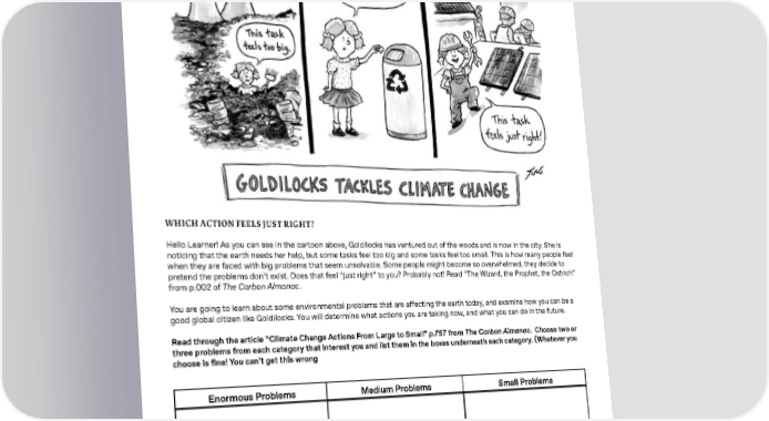 Worksheet: Goldilocks Tackles Climate Change,P1 WHICH ACTION FEELS JUST RIGHT? Hello Learner! As you can see in the cartoon above, Goldilocks has ventured out of the woods and is now in the city. She is noticing that the earth needs her help, but some tasks feel too big and some tasks feel too small. This is how many people feel when they are faced with big problems that seem unsolvable. Some people might become so overwhelmed, they decide to pretend the problems don’t exist. Does that feel “just right” to you? Probably not! Read “The Wizard, the Prophet, the Ostrich” from p.002 of The Carbon Almanac. You are going to learn about some environmental problems that are a昀昀ecting the earth today, and examine how you can be a good global citizen like Goldilocks. You will determine what actions you are taking now, and what you can do in the future. Read through the article “Climate Change Actions From Large to Small” p.757 from The Carbon Almanac. Choose two or three problems from each category that interest you and list them in the boxes underneath each category. (Whatever you choose is 昀椀ne! You can’t get this wrong Enormous Problems Medium Problems Small Problems 19