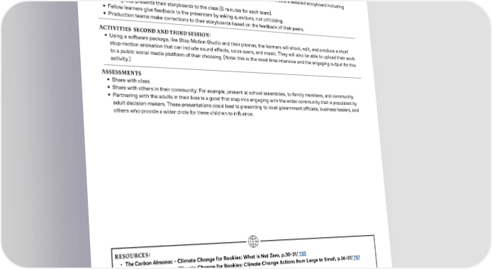 SECTION 2 - Climate Change for Rookies How to Live in a Carbon-Neutral World by 2050, OPT 2, P2 ACTIVITIES SECOND SESSION: • Show examples of storyboards to explain what they are and their purpose in the creative process. • Learner production teams 昀椀nalize their script for their stop-motion project and create a detailed storyboard including dialogue, sound e昀昀ects and music. • Each group presents their storyboards to the class (5 minutes for each team). • Fellow learners give feedback to the presenters by asking questions, not criticizing. • Production teams make corrections to their storyboards based on the feedback of their peers. ACTIVITIES SECOND AND THIRD SESSION: • Using a software package, like Stop Motion Studio and their phones, the learners will shoot, edit, and produce a short stop-motion animation that can include sound e昀昀ects, voice overs, and music. They will also be able to upload their work to a public social media platform of their choosing. (Note: this is the most time intensive and the engaging output for this activity.) ASSESSMENTS • Share with class • Share with others in their community: For example, present at school assemblies, to family members, and community. • Partnering with the adults in their lives is a good 昀椀rst step into engaging with the wider community that is populated by adult decision-makers. These presentations could lead to presenting to local government o昀케cials, business leaders, and others who provide a wider circle for these children to in昀氀uence. T RESOURCES: • The Carbon Almanac - Climate Change for Rookies: What is Net Zero, p.30-31/ 755 • The Carbon Almanac - Climate Change for Rookies: Climate Change Actions from Large to Small, p.36-37/ 757 • Guide to Lego Stop-Motion • Net-zero living: How your day will look in a carbon-neutral world • Computers with access to internet for research • Low-cost effective software package like Stop Motion Studio which works on Apple and Android/windows-based phones and the company does have school discounts • Tripod for holding phones • Smartphone for recording images and sound • Lego bricks and characters • Art materials 17