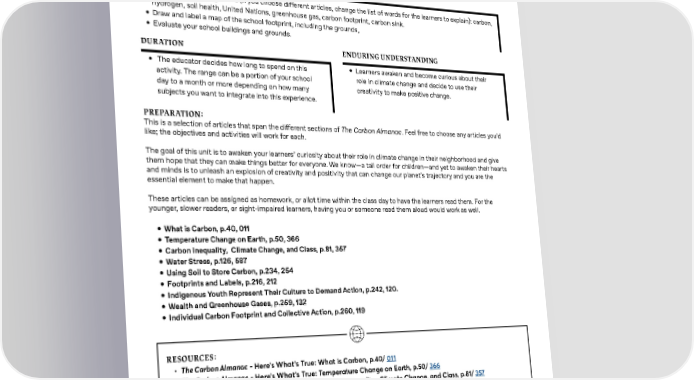 8+, Math, Science, & Social Studies Making a Map of Opportunity,P1 AGE RANGE: 8+ SUBJECTS: Math, Science, & Social Studies OBJECTIVES • De昀椀ne the following terms (if you choose di昀昀erent articles, change the list of words for the learners to explain): carbon, hydrogen, soil health, United Nations, greenhouse gas, carbon footprint, carbon sink. • Draw and label a map of the school footprint, including the grounds, • Evaluate your school buildings and grounds. DURATION ENDURING UNDERSTANDING • The educator decides how long to spend on this • Learners awaken and become curious about their activity. The range can be a portion of your school role in climate change and decide to use their day to a month or more depending on how many creativity to make positive change. subjects you want to integrate into this experience. PREPARATION: This is a selection of articles that span the di昀昀erent sections of The Carbon Almanac. Feel free to choose any articles you’d like; the objectives and activities will work for each. The goal of this unit is to awaken your learners’ curiosity about their role in climate change in their neighborhood and give them hope that they can make things better for everyone. We know—a tall order for children—and yet to awaken their hearts and minds is to unleash an explosion of creativity and positivity that can change our planet’s trajectory and you are the essential element to make that happen. These articles can be assigned as homework, or allot time within the class day to have the learners read them. For the younger, slower readers, or sight-impaired learners, having you or someone read them aloud would work as well. • What is Carbon, p.40, 011 • Temperature Change on Earth, p.50, 366 • Carbon Inequality, Climate Change, and Class, p.81, 357 • Water Stress, p.126, 587 • Using Soil to Store Carbon, p.234, 254 • Footprints and Labels, p.216, 212 • Indigenous Youth Represent Their Culture to Demand Action, p.242, 120. • Wealth and Greenhouse Gases, p.259, 132 • Individual Carbon Footprint and Collective Action, p.260, 119 T RESOURCES: • The Carbon Almanac - Here’s What’s True: What is Carbon, p.40/ 011 • The Carbon Almanac - Here’s What’s True: Temperature Change on Earth, p.50/ 366 • The Carbon Almanac - Here’s What’s True: Carbon Inequality, Climate Change, and Class, p.81/ 357 • The Carbon Almanac - Impacts: Water Stress, p.126/ 587 • The Carbon Almanac - Solutions: Using Soil to Store Carbon, p.234/ 254 • The Carbon Almanac - Solutions: Footprints and Labels, p.216/ 212 • The Carbon Almanac - Whose Job Is it?: Indigenous Youth Represent Their Culture to Demand Action, p. 242/ 120 • The Carbon Almanac - Whose Job Is it?: Wealth and Greenhouse Gases, p.259/ 132 • The Carbon Almanac - Whose Job Is it?: Individual Carbon Footprint And Collective Action, p.260/ 119 • Pencils and erasers • Blank paper, or a notebook dedicated to this project 57
