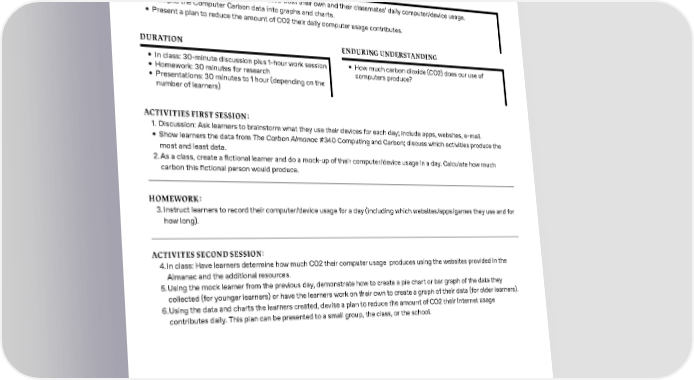 SECTION 3 - Here’s What’s True 12+, Math & Science Computing and Carbon AGE RANGE: 12+ Math & Science SUBJECTS: OBJECTIVES • Determine how much carbon is produced from their own and their classmates’ daily computer/device usage. • Compile the Computer Carbon data into graphs and charts. • Present a plan to reduce the amount of CO2 their daily computer usage contributes. DURATION ENDURING UNDERSTANDING • In class: 30-minute discussion plus 1-hour work session • How much carbon dioxide (CO2) does our use of • Homework: 30 minutes for research computers produce? • Presentations: 30 minutes to 1 hour (depending on the number of learners) ACTIVITIES FIRST SESSION: 1. Discussion: Ask learners to brainstorm what they use their devices for each day; include apps, websites, e-mail. • Show learners the data from The Carbon Almanac #340 Computing and Carbon; discuss which activities produce the most and least data. 2. As a class, create a 昀椀ctional learner and do a mock-up of their computer/device usage in a day. Calculate how much carbon this 昀椀ctional person would produce. HOMEWORK: 3. Instruct learners to record their computer/device usage for a day (including which websites/apps/games they use and for how long). ACTIVITES SECOND SESSION: 4. In class: Have learners determine how much CO2 their computer usage produces using the websites provided in the Almanac and the additional resources. 5. Using the mock learner from the previous day, demonstrate how to create a pie chart or bar graph of the data they collected (for younger learners) or have the learners work on their own to create a graph of their data (for older learners). 6. Using the data and charts the learners created, devise a plan to reduce the amount of CO2 their Internet usage contributes daily. This plan can be presented to a small group, the class, or the school. RESOURCES: T • The Carbon Almanac - Here’s What’s True: Computing and Carbon, p.88/ 340 • Generation Carbon, An Almanac for Kids, ebook, p.10 - p.22 • The Internet’s Carbon Footprint Infographic, (or other relevant, up to date websites that provide energy usage of devices and websites) • Carbon Emissions Calculator 22