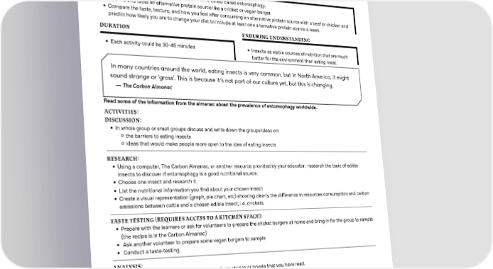 SECTION 6 - Solutions 12+, Arts, Literature, Science, & Social Studies Edible Insects AGE RANGE: 12+ SUBJECTS: Arts, Literature, Science, & Social Studies OBJECTIVES • Identify the barriers to eating insects, which is called called entomophagy. • Prepare and taste an alternative protein source like a cricket or vegan burger. • Compare the taste, texture, and how you feel after consuming an alternative protein source with a beef or chicken and predict how likely you are to change your diet to include at least one alternative protein source a week. DURATION ENDURING UNDERSTANDING • Each activity could be 30-45 minutes • Insects as viable sources of nutrition that are much better for the environment than eating meat. In many countries around the world, eating insects is very common, but in North America, it might sound strange or ‘gross’. This is because it’s not part of our culture yet, but this is changing. — The Carbon Almanac Read some of the information from the almanac about the prevalence of entomophagy worldwide. ACTIVITIES: DISCUSSION: • In whole group or small groups discuss and write down the groups ideas on: ʦ the barriers to eating insects ʦ ideas that would make people more open to the idea of eating insects RESEARCH: • Using a computer, The Carbon Almanac, or another resource provided by your educator, research the topic of edible insects to discover if entomophagy is a good nutritional source. • Choose one insect and research it • List the nutritional information you 昀椀nd about your chosen insect • Create a visual representation (graph, pie chart, etc) showing clearly the di昀昀erence in resources consumption and carbon emissions between cattle and a chosen edible insect, i.e. crickets. TASTE TESTING (REQUIRES ACCESS TO A KITCHEN SPACE): • Prepare with the learners or ask for volunteers to prepare the cricket burgers at home and bring in for the group to sample (the recipe is in the Carbon Almanac) • Ask another volunteer to prepare some vegan burgers to sample • Conduct a taste-testing ANALYSIS: • List 昀椀ve literary characters that you know from stories or novels that you have read. • After each character’s name answer the questions: ʦ Do you think this character would be willing to try something new? ʦ Then after that answer, explain why or why not they would be willing to try something new. RESOURCES: T • The Carbon Almanac: Solutions: Edible Insects, p.208-209/ 104 • Generation Carbon, An Almanac for Kids, ebook, p.36 • 2016 study comparing nutritional stats of various meats and insects 36