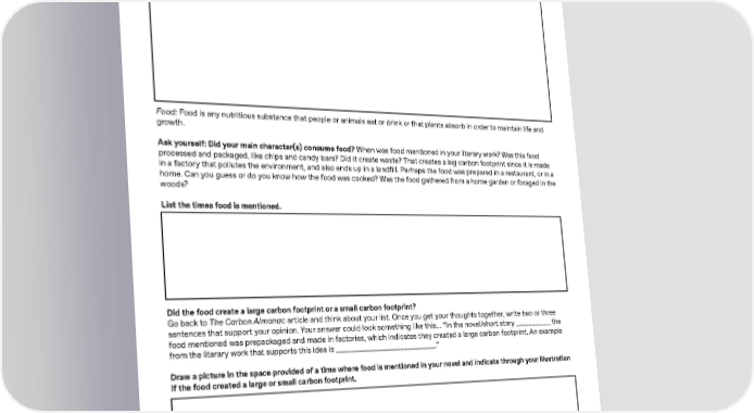 Worksheet: Environmental Report Card; Pass or Fail?P2 Draw a picture in the space provided of an energy-e昀케cient (small footprint) way your character(s) traveled, making sure to include a depiction of the setting (time and place) in your illustration. Food: Food is any nutritious substance that people or animals eat or drink or that plants absorb in order to maintain life and growth. Ask yourself: Did your main character(s) consume food? When was food mentioned in your literary work? Was this food processed and packaged, like chips and candy bars? Did it create waste? That creates a big carbon footprint since it is made in a factory that pollutes the environment, and also ends up in a land昀椀ll. Perhaps the food was prepared in a restaurant, or in a home. Can you guess or do you know how the food was cooked? Was the food gathered from a home garden or foraged in the woods? List the times food is mentioned. Did the food create a large carbon footprint or a small carbon footprint? Go back to The Carbon Almanac article and think about your list. Once you get your thoughts together, write two or three sentences that support your opinion. Your answer could look something like this… “In the novel/short story ___________ the food mentioned was prepackaged and made in factories, which indicates they created a large carbon footprint. An example from the literary work that supports this idea is ____________________________.” Draw a picture in the space provided of a time where food is mentioned in your novel and indicate through your illustration if the food created a large or small carbon footprint. 53
