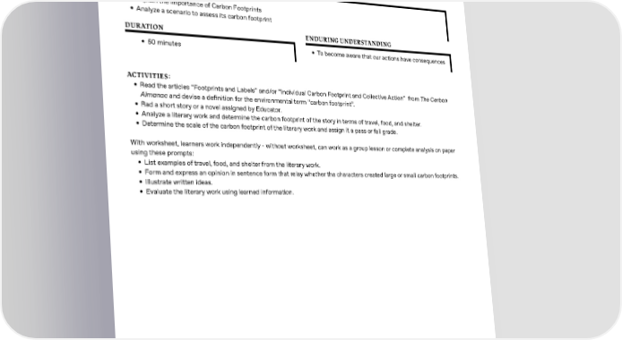 SECTION 7 - Whose Job Is It? 8+, History & Social Studies Environmental Report Card; Pass or Fail? AGE RANGE: 8+ SUBJECTS: History & Social Studies LEARNING OBJECTIVE • De昀椀ne the phrase Carbon Footprint • Explain the importance of Carbon Footprints • Analyze a scenario to assess its carbon footprint DURATION ENDURING UNDERSTANDING • 50 minutes • To become aware that our actions have consequences ACTIVITIES: • Read the articles “Footprints and Labels” and/or “Individual Carbon Footprint and Collective Action” from The Carbon Almanac and devise a de昀椀nition for the environmental term “carbon footprint”. • Rad a short story or a novel assigned by Educator. • Analyze a literary work and determine the carbon footprint of the story in terms of travel, food, and shelter. • Determine the scale of the carbon footprint of the literary work and assign it a pass or fail grade. With worksheet, learners work independently - without worksheet, can work as a group lesson or complete analysis on paper using these prompts: • List examples of travel, food, and shelter from the literary work. • Form and express an opinion in sentence form that relay whether the characters created large or small carbon footprints. • Illustrate written ideas. • Evaluate the literary work using learned information. T RESOURCES: • The Carbon Almanac - Solutions: Footprints and labels, p.216/ 212 • The Carbon Almanac - Whose Job is it?: Individual Carbon Footprint and Collective Action, p.260/ 119 • Short Story or Novel of Educator’s Choice • “Environmental Report Card; Pass or Fail” worksheet • Pencil, colors optional 51