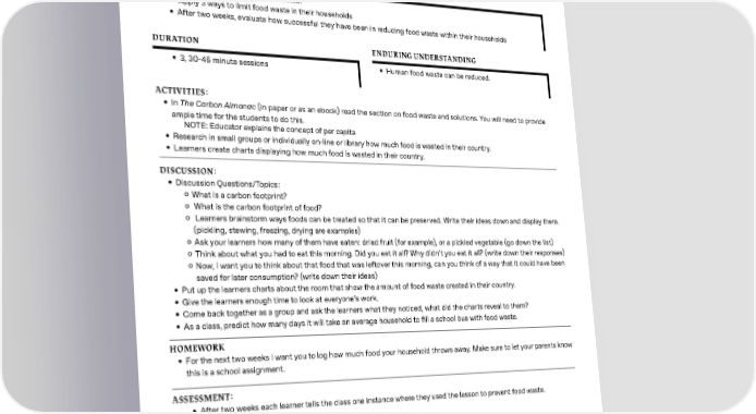 SECTION 6 - Solutions 12+, Science & Economics Food Waste and Food Loss AGE RANGE: 12+ SUBJECTS: Science & Economics OBJECTIVES • Recognize ways that food is wasted. • Apply 3 ways to limit food waste in their households • After two weeks, evaluate how successful they have been in reducing food waste within their households DURATION ENDURING UNDERSTANDING • 3, 30-45 minute sessions • Human food waste can be reduced. ACTIVITIES: • In The Carbon Almanac (in paper or as an ebook) read the section on food waste and solutions. You will need to provide ample time for the students to do this. NOTE: Educator explains the concept of per capita • Research in small groups or individually on-line or library how much food is wasted in their country. • Learners create charts displaying how much food is wasted in their country. DISCUSSION: • Discussion Questions/Topics: ʦ What is a carbon footprint? ʦ What is the carbon footprint of food? ʦ Learners brainstorm ways foods can be treated so that it can be preserved. Write their ideas down and display them. (pickling, stewing, freezing, drying are examples) ʦ Ask your learners how many of them have eaten: dried fruit (for example), or a pickled vegetable (go down the list) ʦ Think about what you had to eat this morning. Did you eat it all? Why didn’t you eat it all? (write down their responses) ʦ Now, I want you to think about that food that was leftover this morning, can you think of a way that it could have been saved for later consumption? (write down their ideas) • Put up the learners charts about the room that show the amount of food waste created in their country. • Give the learners enough time to look at everyone’s work. • Come back together as a group and ask the learners what they noticed, what did the charts reveal to them? • As a class, predict how many days it will take an average household to 昀椀ll a school bus with food waste. HOMEWORK • For the next two weeks I want you to log how much food your household throws away. Make sure to let your parents know this is a school assignment. ASSESSMENT: • After two weeks each learner tells the class one instance where they used the lesson to prevent food waste. T RESOURCES: • The Carbon Almanac - Solutions: Food Waste and Food Loss, p.201/ 031 • flipcharts and markers or digital documents for displaying the results of the class discussion 37