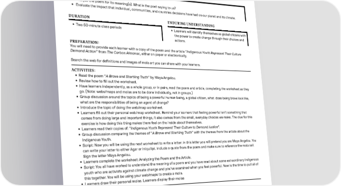 SECTION 1 - The Beginning 12+, Arts, Literature, & Social Studies You Are Brave AGE RANGE: 12+ SUBJECTS: Arts, Literature, & Social Studies OBJECTIVES • Identify the message(s) of the poem • Analyze the poem for its meaning(s). What is the poet saying to us? • Evaluate the impact that individual, communities, and countries decisions have had on our planet and its climate. DURATION ENDURING UNDERSTANDING • Two 50-minute class periods • Learners will identify themselves as global citizens with the power to create change through their choices and actions. PREPARATION: You will need to provide each learner with a copy of the poem and the article “Indigenous Youth Represent Their Culture Demand Action” from The Carbon Almanac, either on paper or electronically. Search the web for de昀椀nitions and images of mola art you can share with your learners. ACTIVITIES: • Read the poem “A Brave and Startling Truth” by Maya Angelou. • Review how to 昀椀ll out the worksheet. • Have learners independently, as a whole group, or in pairs, read the poem and article, completing the worksheet as they go. (Note: webs/maps and molas are to be done individually, not in groups.) • Group discussion around the topics of being a powerful human being, a global citizen, what does being brave look like, what are the responsibilities of being an agent of change? • Introduce the topic of doing the web/map worksheet. • Learners 昀椀ll out their personal web/map worksheet. Remind your learners that feeling powerful isn’t something that comes from doing large and important things, it also comes from the small, everyday choices we make. The clue for this exercise is how doing this thing makes them feel on the inside about themselves. • Learners read their copies of: “Indigenous Youth Represent Their Culture to Demand Justice”. • Group discussion comparing the themes of “A Brave and Startling Truth” with the themes from the article about the Indigenous Youth. • Script: Now you will be using the next worksheet to write a letter: In this letter you will pretend you are Maya Angelou. You can write your letter to either Agar or Iniquilipi. Include a quote from the poem and make sure to reference the mola sail. Sign the letter Maya Angelou. • Learners complete the worksheet: Analyzing the Poem and the Article. • Script: You all have worked to understand the meaning of a poem and you have read about some extraordinary indigenous youth who are activists against climate change and you’ve examined when you feel powerful. Now is the time to pull all of this together. You will be using your web/maps to create a mola. • Learners draw their personal molas. Learners display their molas ASSESSMENT: • At the educator’s discretion points can be assigned for completed worksheets and participation in discussions to determine a cumulative grade. T RESOURCES: • The Carbon Almanac - Introduction: A Brave and Startling Truth, p. 16,17 • The Carbon Almanac - Whose job is it?: Indigenous Youth Represent Their Culture to Demand Action, p. 242/120 • Worksheet: Analyzing the Poem and the Article • Pencil, colors optional and paper 8