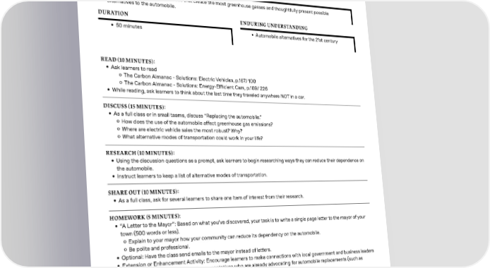 SECTION 6 - Solutions 12+, Economics & Civics Replacing the Automobile AGE RANGE: 12+ SUBJECTS: Economics & Social Studies LEARNING OUTCOMES • Identify the transportation modes that create the most greenhouse gasses and thoughtfully present possible alternatives to the automobile. DURATION ENDURING UNDERSTANDING • 50 minutes • Automobile alternatives for the 21st century READ (10 MINUTES): • Ask learners to read ʦ The Carbon Almanac - Solutions: Electric Vehicles, p.167/ 100 ʦ The Carbon Almanac - Solutions: Energy-E昀케cient Cars, p.169/ 226 • While reading, ask learners to think about the last time they traveled anywhere NOT in a car. DISCUSS (15 MINUTES): • As a full class or in small teams, discuss “Replacing the automobile.” ʦ How does the use of the automobile a昀昀ect greenhouse gas emissions? ʦ Where are electric vehicle sales the most robust? Why? ʦ What alternative modes of transportation could work in your life? RESEARCH (10 MINUTES): • Using the discussion questions as a prompt, ask learners to begin researching ways they can reduce their dependence on the automobile. • Instruct learners to keep a list of alternative modes of transportation. SHARE OUT (10 MINUTES): • As a full class, ask for several learners to share one item of interest from their research. HOMEWORK (5 MINUTES): • “A Letter to the Mayor”: Based on what you’ve discovered, your task is to write a single page letter to the mayor of your town (500 words or less). ʦ Explain to your mayor how your community can reduce its dependency on the automobile. ʦ Be polite and professional. • Optional: Have the class send emails to the mayor instead of letters. • Extension or Enhancement Activity: Encourage learners to make connections with local government and business leaders by sending emails or calling local representatives who are already advocating for automobile replacements (such as bicycle shop owners). T RESOURCES: • The Carbon Almanac - Solutions: Electric Vehicles, p.167/ 100 • The Carbon Almanac - Solutions: Energy-Efficient Cars, p.169/ 226 44
