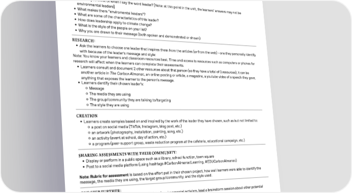 SECTION 7 - Whose Job Is It? The Spirit of Change,P2 ACTIVITIES: GROUP DISCUSSION: Whole group or small groups. Use the following questions: • What is a leader? • Who do you think of when I say the word leader? [Note: at this point in the unit, the learners’ answers may not be environmental leaders] • What makes them “enviromental leaders”? • What are some of the characteristics of this leader? • How does leadership apply to climate change? • What is the style of the people on your list? • Why you are drawn to their message (both spoken and demonstrated or shown) RESEARCH: • Ask the learners to choose one leader that inspires them from the articles (or from the web) - one they personally identify with because of the leader’s message and style: Note: You know your learners and classroom resources best. Time and access to resources such as computers or phones for research will a昀昀ect when the learners can complete their assessments. • Learners consult and document 2 other resources about that person (so they have a total of 3 resources), it can be another article in The Carbon Almanac, an online posting or article, a magazine, a youtube video of a speech they gave, anything that exposes the learner to the person’s message. • Learners dentify their chosen leader’s: ʦ Message ʦ The media they are using ʦ The group/community they are talking to/targeting ʦ The style they are using CREATION • Learners create samples based on and inspired by the work of the leader they have chosen, such as but not limited to: ʦ a post on social media (TikTok, Instagram, blog post, etc.) ʦ an artwork (photography, installation, painting, song, etc.) ʦ an activity (event at school, day of action, etc.) ʦ a program (peer-support group, waste reduction program at the cafeteria, educational campaign, etc.) SHARING ASSESSMENTS WITH THEIR COMMUNITY: • Display or perform in a public space such as a library, school function, town square • Post to a social media platform (using hashtags #CarbonAlmanacLearning, #EDUCarbonAlmanac) Note: Rubric for assessment Is based on the e昀昀ort put in their chosen project, how well learners were able to identify the message, the media they are using, the target group/community, and the style used. ONE STEP FURTHER: If your learners are deeply engaged in this idea of environmental activism, lead a brainstorm session about other potential local and digital venues to share the work they created. T RESOURCES: • The Carbon Almanac - Leading the Way: Influential Artists and Climate, p.282/ 142 • Earth.org 10 Inspiring Climate Activists List • NAAEE Change Fellowship 50