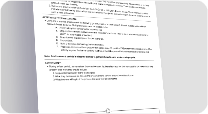 SECTION 4 - Scenarios Creating the World I Want,P2 ACTIVITIES THIRD SESSION: • Using the information from the two articles write two di昀昀erent outlines/plotlines - choose a time period 30, 50, or 100 years from today to use for both scenarios: 1. The 昀椀rst plot line: what will Earth look like in 30 (or 50 or 100) years if we change nothing. These outlines or plotlines indicate essential turning points which lead to your learners’ projected conclusion. These can be constructed in outline form or as a timeline. 2. The second plot line: what will Earth look like in 30 (or 50 or 100) years if we do change. These outlines or plotlines indicate essential turning points which lead to the learners’ projected conclusion. Again, these can be constructed in outline form or timeline. ACTIVITIES FOURTH SESSION: • Using the scenarios, create one of the following (as individuals or in small groups): All work must be produced from research-based evidence. Multiple sources must be used and cited. A. A short story that compares the two scenarios. B. Stop-motion animations (there are some resources listed in the “How to live in a carbon neutral world by 2050” for stop-motion animation). C. Graphic novel that compares the two scenarios. D. Short videos. E. Build 2 dioramas contrasting the two scenarios. F. Produce a commercial for a product that people living 30 (or 50 or 100) years from now need or value. (This activity requires the learner to draw, illustrate, or build the product before they shoot their commercial). Note: Provide several periods in-class for learners to gather information and work on their projects. ASSESSMENT: • During a class period, learners share their creations and list the reliable sources that were used for the research. As they present their work they should include: 1. Key point(s) learned by doing their project 2. What they think could be done in the present time to achieve a more favorable outcome. 3. What they are willing to do to produce the more favorable outcome. T RESOURCES: • The Carbon Almanac - Scenarios: Understanding the Five Scenarios, p. 96/ 039 • The Carbon Almanac - Climate Change for Rookies: What is Net Zero, p.30-31/ 755 • The Carbon Almanac -Impacts: Biodiversity Loss and Climate Change, p.135/ 074 • The Carbon Almanac - Climate Change for Rookies: Climate Change Actions from Large to Small, p.36-37/ 757 • Art supplies • Recording equipment /smart phones • Laptops • Research materials (websites, articles, books, interviews, etc) 27