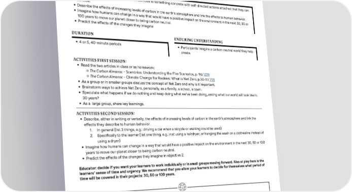 SECTION 4 - Scenarios 12+ History, Science, & Social Studies Creating the World I Want,P1 AGE RANGE: 12+ History, Science, & Social Studies SUBJECTS: OBJECTIVES • Move from climate change as an abstract idea to something concrete with self-directed actions attached that they can achieve. • Describe the e昀昀ects of increasing levels of carbon in the earth’s atmosphere and link the e昀昀ects to human behavior. • Imagine how humans can change in a way that would have a positive impact on the environment in the next 30, 50 or 100 years to move our planet closer to being carbon neutral. • Predict the e昀昀ects of the changes they imagine DURATION ENDURING UNDERSTANDING • 4 or 5, 40-minute periods • Participants imagine a carbon-neutral world they help create. ACTIVITIES FIRST SESSION: • Read the two articles in class or as homework: ʦ The Carbon Almanac - Scenarios: Understanding the Five Scenarios, p. 96/ 039 ʦ The Carbon Almanac - Climate Change for Rookies: What is Net Zero, p.30-31/ 755 • As a group or in smaller groups discuss the concept of Net Zero and why is it important. • Brainstorm ways to achieve Net Zero, personally, as a family, a school, a town. • Speculate what happens if we do nothing and keep doing what we’ve been doing, asking what our world will look like in 30 years? • As a large group, share key learnings. ACTIVITIES SECOND SESSION: • Describe, either in writing or verbally, the e昀昀ects of increasing levels of carbon in the earth’s atmosphere and link the e昀昀ects they describe to human behavior. 1. In general (list 3 things, e.g.: driving a car when a bicycle or walking could be used) 2. Speci昀椀cally to the learner (list one thing, e.g.: not using a hairdryer, or hanging the wash on a clothesline instead of using a dryer) • Imagine how humans can change in a way that would have a positive impact on the environment in the next 30, 50 or 100 years to move our planet closer to being carbon neutral. • Predict the e昀昀ects of the changes they imagine in objective 2. Educator: decide if you want your learners to work individually or in small groups moving forward. Also at play here is the learners’ sense of time and urgency. We recommend that you allow your learners to decide for themselves what period of time will be covered in their projects: 30, 50 or 100 years. T RESOURCES: • The Carbon Almanac - Scenarios: Understanding the Five Scenarios, p. 96/ 039 • The Carbon Almanac - Climate Change for Rookies: What is Net Zero, p.30-31/ 755 • The Carbon Almanac -Impacts: Biodiversity Loss and Climate Change, p.135/ 074 • The Carbon Almanac - Climate Change for Rookies: Climate Change Actions from Large to Small, p.36-37/ 757 • Art supplies • Recording equipment /smart phones • Laptops • Research materials (websites, articles, books, interviews, etc) 26