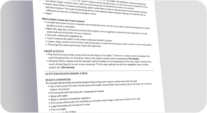 SECTION 6 - Solutions Compost-ables, PART B, P2 ACTIVITIES FIRST SESSION, CONTINUED. What makes great compost: • Brown matter: Brown matter includes materials such as twigs, branches, paper, and cardboard—basically anything dry or woody. In most cases, items in the “brown” category will be naturally brown, but there are certainly exceptions to that rule. Brown matter contains carbon, which provides energy for the bene昀椀cial microbes in the compost. • Green matter: When it comes to composting, green matter refers to natural waste products that were recently growing and have moisture. This could include things like fruit and vegetable waste and grass clippings, but materials such as co昀昀ee grounds are also considered to be green matter. • Water What is better to leave out of your compost: • Consider what goes into your composter and the potential harm it can do to your plants. Most animal byproducts need to be left out of your composter: • Meat, 昀椀sh, egg, dairy, and poultry products (the exception here is eggshells, dry them 昀椀rst and break them into small pieces before putting them into your compost). • Oils, both cooking and vegetable oils. • Coal or charcoal ash which could contain substances harmful to plants. • Leaves, twigs, and the fruit from black walnut trees which contain the toxin juglone, which is known to harm many plants. • Trimmings from plants previously treated with pesticides. GROUP ACTIVITY • Play the Dictionary activity, using only terms that apply to this subject. The aim is to create a common language to be used throughout this unit. (Compost, carbon sink, organic matter, carbon sequestering.) (10 minutes) • Using the matrix, analyze what the learner(s) had for breakfast or lunch (depending on the time of day) in terms of how much of what they did not eat can be composted. This includes peelings from fruit and vegetables, bread, noodles, protein, etc. (20 minutes) ACTIVITIES SECOND SESSION, PART B BUILD A COMPOSTER: for younger learners prep the bottles ahead of time so they won’t have to use the knives. (10 minutes) • Use a nail to punch 10 holes into the sides of the bottle. Scatter these holes randomly about the bottle. Do not punch holes in the bottom • Fill the bottle with alternating dirt, newspaper and leaves. • Spray with water. • Begin to add the compostable vegetation. • Put the top of the bottle into the bottle as a funnel for water (keep a towel over top when not in use). • Label the bottle with the learner’s name. • Put in sunlight. • Stir every couple of days. • Add more compostable vegetation and soil regularly. 41