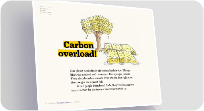 Generation Carbon: It’s time to start. Carbon overload! Our planet needs fresh air to stay healthy too. Things like trees and soil and oceans act like sponges to help. They absorb carbon dioxide from the air. But right now, the sponges are almost full. When people burn fossil fuels, they’re releasing too much carbon for the trees and oceans to soak up. 17 | Check out The Carbon Almanac to learn more.