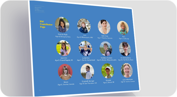 Generation Carbon: It’s time to start. Kid Contributor Page Matilde Righi Ivan Edie Chua Rory Age 8, Bologna, Italy Age 8, Minneapolis, MN Age 7, Toronto, Canada Age 5, California Aubrielle Lucija Biuk Matthew NeJame Arlo DeCardenas Age 8, Grand Rapids, MI Age 11, Zurich, Switzerland Age 15, Boston, Massachusetts Age 18, Fort Worth, Texas Grace Elizabeth Granger Grayson Julia Ankenmann Toronto, Canada Toronto, Canada Age 6, Age 11, San Francisco, CA Age 5, Detroit, MI Age 15, 72