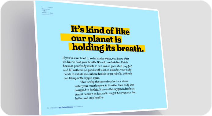 Generation Carbon: It’s time to start. It’s kind of like our planet is holding its breath. If you’ve ever tried to swim under water, you know what it’s like to hold your breath. It’s not comfortable. This is because your body starts to run low on good stu昀昀 (oxygen) and 昀椀ll with not-so-good stu昀昀 (carbon dioxide). Your body needs to exhale the carbon dioxide to get rid of it, before it can 昀椀ll up with oxygen again. This is why the second you’re back above water your mouth opens to breathe. Your body was designed to do this. It needs the oxygen in fresh air. And it needs it as fast as it can get it, so you can feel better and stay healthy. 16 | Check out The Carbon Almanac to learn more.