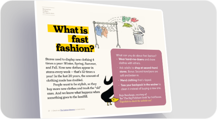 Generation Carbon: It’s time to start. What is fast fashion? What can you do about fast fashion? Stores used to display new clothing 4 - Wear hand-me-downs and share times a year: Winter, Spring, Summer, clothes with others. and Fall. Now new clothes appear in - Ask adults to shop at second-hand stores every week — that’s 52 times a stores. Bonus: Second-hand jeans are year! In the last 20 years, the amount of soft and broken in. clothing made has doubled. - Mend clothing that’s ripped. People want to be stylish, so they - Toss your backpack in the washer to buy more new clothes and trash the “old” clean it instead of buying a new one. ones. And we know what happens when something goes to the land昀椀ll. Bojo Bandango, courtesy of the ‘The Big PickSure Book’ by OuiChoose. Tap/click to check the website out! 37 | Check out The Carbon Almanac to learn more.