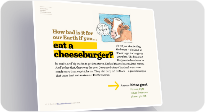 Generation Carbon: It’s time to start. How bad is it for our Earth if you... eat a It’s not just about eating the burger — it’s about all it took to get the burger to cheeseburger? your plate. The food most likely needed machines to be made, and big trucks to get it to stores. Each of those releases a lot of carbon. And before that, there was the cow. Cows need a ton of land and water — so much more than vegetables do. They also burp out methane — a greenhouse gas that traps heat and makes our Earth warmer. Answer: Not so great. For now, try to reduce the amount of meat you eat. 45 | Check out The Carbon Almanac to learn more.