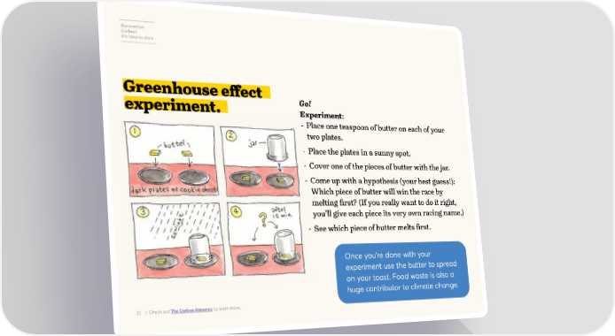 Generation Carbon: It’s time to start. Greenhouse e昀昀ect Go! experiment. Experiment: - Place one teaspoon of butter on each of your two plates. - Place the plates in a sunny spot. - Cover one of the pieces of butter with the jar. - Come up with a hypothesis (your best guess!): Which piece of butter will win the race by melting 昀椀rst? (If you really want to do it right, you’ll give each piece its very own racing name.) - See which piece of butter melts 昀椀rst. Once you’re done with your experiment use the butter to spread on your toast. Food waste is also a huge contributor to climate change. 21 | Check out The Carbon Almanac to learn more.