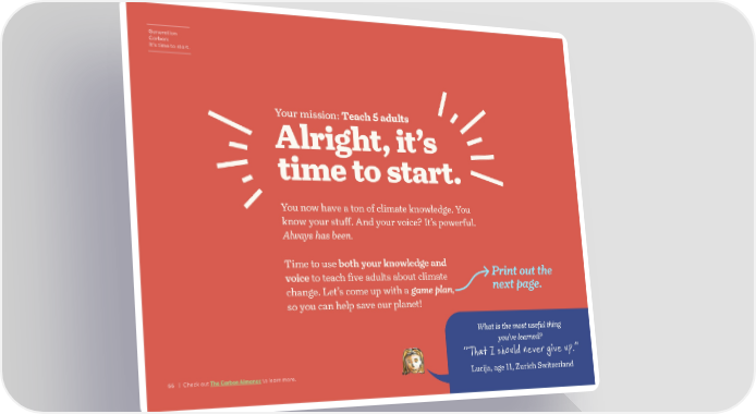 Generation Carbon: It’s time to start. Your mission: Teach 5 adults Alright, it’s time to start. You now have a ton of climate knowledge. You know your stu昀昀. And your voice? It’s powerful. Always has been. Time to use both your knowledge and Print out the voice to teach 昀椀ve adults about climate next page. change. Let’s come up with a game plan, so you can help save our planet! What is the most useful thing you’ve learned? “That I should never give up.” 66 | Check out The Carbon Almanac to learn more. Lucija, age 11, Zurich Switzerland