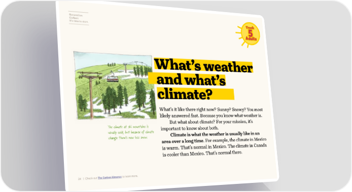 Generation Carbon: It’s time to start. What’s weather and what’s climate? What’s it like there right now? Sunny? Snowy? You most likely answered fast. Because you know what weather is. TThhe ce clliimmaatte ae at st skki mi moouunnttaaiinns is is s But what about climate? For your mission, it’s uussuuaalllly cy coolldd, b, buut bt beeccaauusse oe of cf clliimmaatte e important to know about both. cchhaanngge te thheerree’’s ns now low leesss ss snnowow.. Climate is what the weather is usually like in an area over a long time. For example, the climate in Mexico is warm. That’s normal in Mexico. The climate in Canada is cooler than Mexico. That’s normal there. 24 | Check out The Carbon Almanac to learn more.