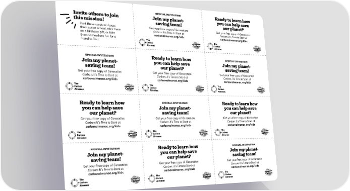 SPECIAL INVITATION Ready to learn how Invite others to join Join my planet- you can help save this mission! saving team! our planet? Print these cards and pass Get your free copy of Generation Get your free copy of Generation them out at school, stick them Carbon: It’s Time to Start at Carbon: It’s Time to Start at on a birthday gift, or hide carbonalmanac.org/kids carbonalmanac.org/kids them somewhere fun for a friend to find. SPECIAL INVITATION Ready to learn how SPECIAL INVITATION Join my planet- you can help save Join my planet- saving team! our planet? saving team! Get your free copy of Generation Get your free copy of Generation Get your free copy of Generation Carbon: It’s Time to Start at Carbon: It’s Time to Start at Carbon: It’s Time to Start at carbonalmanac.org/kids carbonalmanac.org/kids carbonalmanac.org/kids Ready to learn how SPECIAL INVITATION Ready to learn how you can help save Join my planet- you can help save our planet? saving team! our planet? Get your free copy of Generation Get your free copy of Generation Get your free copy of Generation Carbon: It’s Time to Start at Carbon: It’s Time to Start at Carbon: It’s Time to Start at carbonalmanac.org/kids carbonalmanac.org/kids carbonalmanac.org/kids SPECIAL INVITATION Ready to learn how SPECIAL INVITATION Join my planet- you can help save Join my planet- saving team! our planet? saving team! Get your free copy of Generation Get your free copy of Generation Get your free copy of Generation Carbon: It’s Time to Start at Carbon: It’s Time to Start at Carbon: It’s Time to Start at carbonalmanac.org/kids carbonalmanac.org/kids carbonalmanac.org/kids