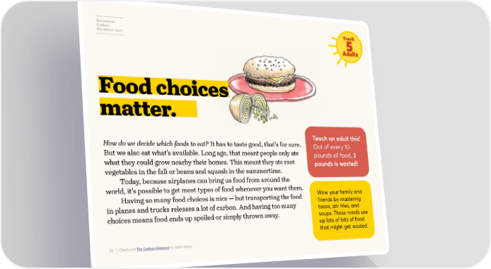 Generation Carbon: It’s time to start. Food choices matter. Teach an adult this! How do we decide which foods to eat? It has to taste good, that’s for sure. Out of every 10 But we also eat what’s available. Long ago, that meant people only ate pounds of food, 3 what they could grow nearby their homes. This meant they ate root pounds is wasted! vegetables in the fall or beans and squash in the summertime. Today, because airplanes can bring us food from around the world, it’s possible to get most types of food whenever you want them. Wow your family and Having so many food choices is nice — but transporting the food friends by mastering in planes and trucks releases a lot of carbon. And having too many tacos, stir fries, and choices means food ends up spoiled or simply thrown away. soups. These meals use up lots of bits of food that might get wasted. 34 | Check out The Carbon Almanac to learn more.