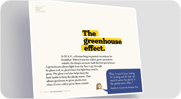 Generation Carbon: It’s time to start. The greenhouse e昀昀ect. In 30 A.D., a Roman king requested cucumbers for breakfast. When it was too cold to grow cucumbers outside, the King’s servants built the 昀椀rst greenhouse. A greenhouse allows light from the Sun to go through its glass roof, so plants have the light they need to grow. The glass roof also helps keep the “Mum, it hasn’t been raining heat inside to keep the plants warm. This for so long and it’s bad. We allows gardeners to grow plants even need to water the plants in when it’s too cold to grow them outside. the garden more often.” 18 | Check out The Carbon Almanac to learn more. Matilde R., 8 years old, Bologna, Italy