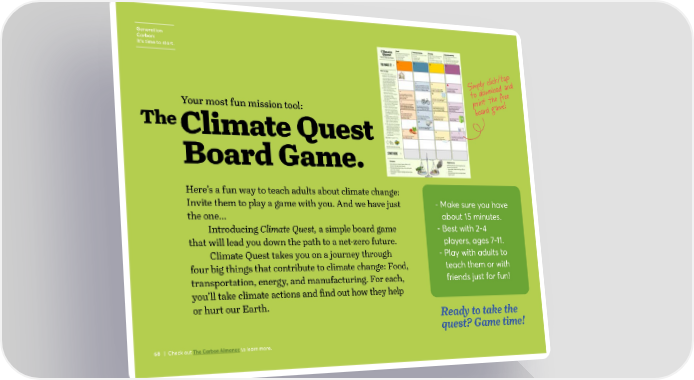 Generation Carbon: It’s time to start. p p aa tt // kk cc ii ll y cy c ll d d mpmp nn SSii d ad a aa oo ll wwnn oo ee ee o do d rr tt hhe fe f t tt t nn ii !! prpr aardrd g gaammee Your most fun mission tool: bboo The Climate Quest Board Game. Here’s a fun way to teach adults about climate change: Invite them to play a game with you. And we have just - Make sure you have the one… about 15 minutes. Introducing Climate Quest, a simple board game - Best with 2-4 that will lead you down the path to a net-zero future. players, ages 7-11. Climate Quest takes you on a journey through - Play with adults to four big things that contribute to climate change: Food, teach them or with transportation, energy, and manufacturing. For each, friends just for fun! you’ll take climate actions and 昀椀nd out how they help or hurt our Earth. Ready to take the quest? Game time! 68 | Check out The Carbon Almanac to learn more.