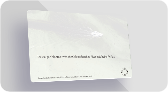 Toxic algae bloom across the Caloosahatchee River in Labelle, Florida. Pedro Portal/Miami Herald/Tribune News Service via Getty Images. 2018.