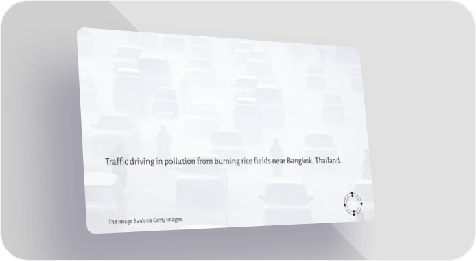 Traf昀椀c driving in pollution from burning rice 昀椀elds near Bangkok, Thailand. The Image Bank via Getty Images.
