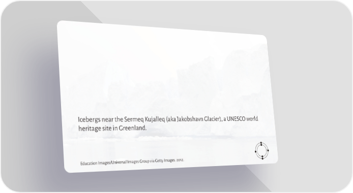 Planet in Peril Page 6 Page 8Icebergs near the Sermeq Kujalleq (aka Jakobshavn Glacier), a UNESCO world heritage site in Greenland. Education Images/Universal Images Group via Getty Images. 2012.