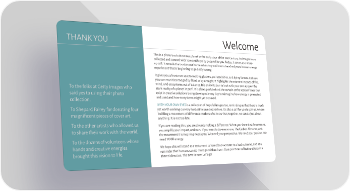 THANK YOU Welcome This is a photo book about our planet in the early days of the 21st Century. Its images were collected and curated with love and hope by people like you. Today, it serves as a wake- up call. It reveals the burden our home is bearing well over a hundred years into an energy experiment that is beginning to go badly wrong. It gives you a front-row seat to melting glaciers, polluted cities, and dying forests. It shows you communities ravaged by flood or by drought. It highlights the extreme impacts of 昀椀re, To the folks at Getty Images who wind, and ecosystems out of balance. It is an invitation to look with your own eyes on the stark reality of a planet in peril. It is also a peek behind the curtain at the seeds of hope that said yes to using their photo exist in creative solutions being developed every day to reimagine how energy is generated collection. and used and how ecosystems might yet be saved. WITH YOUR OWN EYES is a collection of hopeful images too, reminding us that there is much To Shepard Fairey for donating four yet worth working our very hardest to save and restore. It’s also a call for you to join us. We are building a movement of difference-makers who know that, together, we can do just about magni昀椀cent pieces of cover art. anything. It is not too late. To the other artists who allowed us If you are reading this, you are already making a difference. When you share it with someone, to share their work with the world. you amplify your impact, and ours. If you want to do even more, The Carbon Almanac, and the movement it is inspiring needs you. We need your perspective. We need your passion. We To the dozens of volunteers whose need YOUR energy. hands and creative energies We hope this will stand as a testament to how close we came to a bad outcome, and as a brought this vision to life. reminder that humans can do more good than harm if we point our collective efforts in a shared direction. The time is now. Let’s go!