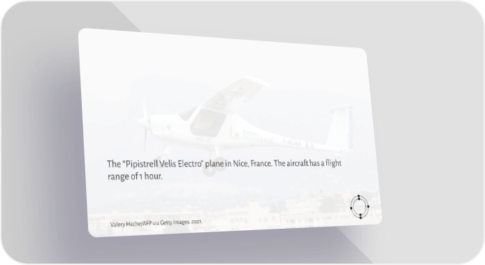 The “Pipistrell Velis Electro” plane in Nice, France. The aircraft has a flight range of 1 hour. Valery Hache/AFP via Getty Images. 2021.