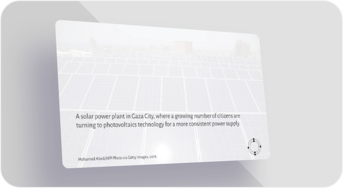 A solar power plant in Gaza City, where a growing number of citizens are turning to photovoltaics technology for a more consistent power supply. Mohamed Abed/AFP Photo via Getty Images. 2016.