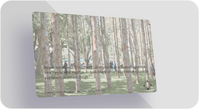 People interact with “Ghost Forest”, an art installation in Madison Square Park, New York by artist Maya Lin. 49 dead Atlantic White Cedar trees were planted as a comment on climate change. © Maya Lin Studio. Photography: Andy Romer, courtesy MSPC. 2021.
