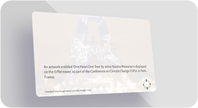 An artwork entitled ‘One Heart One Tree’ by artist Naziha Mestaoui is displayed on the Eiffel tower, as part of the Conference on Climate Change COP21 in Paris, France. Chesnot/Getty Images News via Getty Images. 2015.