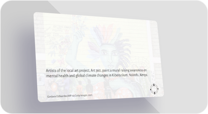 Artists of the local art project, Art 360, paint a mural raising awareness on mental health and global climate changes in Kibera slum, Nairobi, Kenya. Gordwin Odhiambo/AFP via Getty Images. 2021.